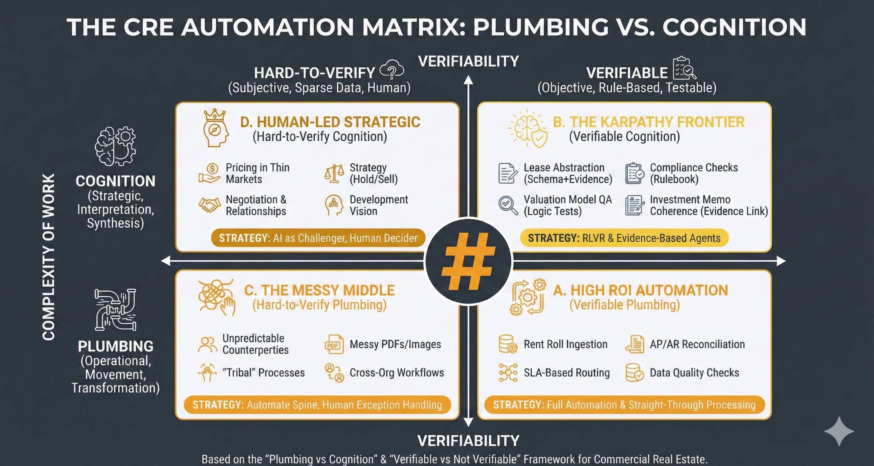 NOTE: Andrej Karpathy is one of the most revered AI researchers in the world and he has recently been arguing that the most promising frontier for AI capability expansion lies in domains where outputs can be verified programmatically - enabling models to learn from feedback loops rather than human labelling. This quadrant represents that frontier applied to CRE.